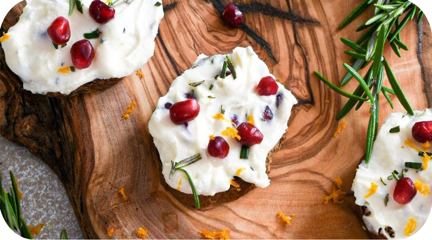 - Scoop about 1 tsp of whipped goat cheese mixture onto each crostini, and garnish with the reserved pomegranate seeds, minced rosemary and orange zest. Enjoy!
